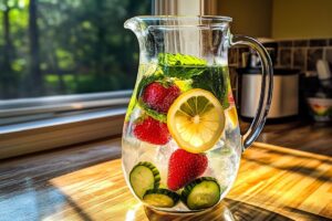 Now that your ingredients are ready, it’s time to infuse the water. Grab a large pitcher and add the sliced lemon, cucumber, strawberries, and fresh mint leaves. Pour the filtered water over the colorful mix. The water will absorb the flavors and aromas from the fruits and herbs, creating a delightful drink. It’s like a mini art project in your kitchen!