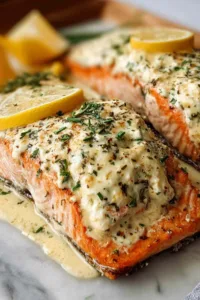 Tender salmon fillets topped with creamy garlic and herb Boursin cheese, baked to perfection in just 30 minutes for an elegant yet effortless dinner.