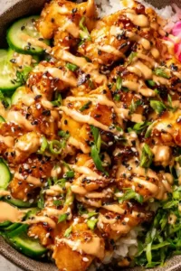 I typically store the components of this Bang Bang Chicken Bowl separately to maintain the best texture and flavor. The crispy chicken will stay good in an airtight container in the refrigerator for up to 3 days, though honestly, it rarely lasts that long in my house. Store the fresh vegetables separately in their own containers, cucumbers and carrots will stay crisp for 1-2 days when stored properly. The sauce keeps beautifully in a sealed jar or airtight container for up to 5 days, and the flavors actually deepen as they sit together.