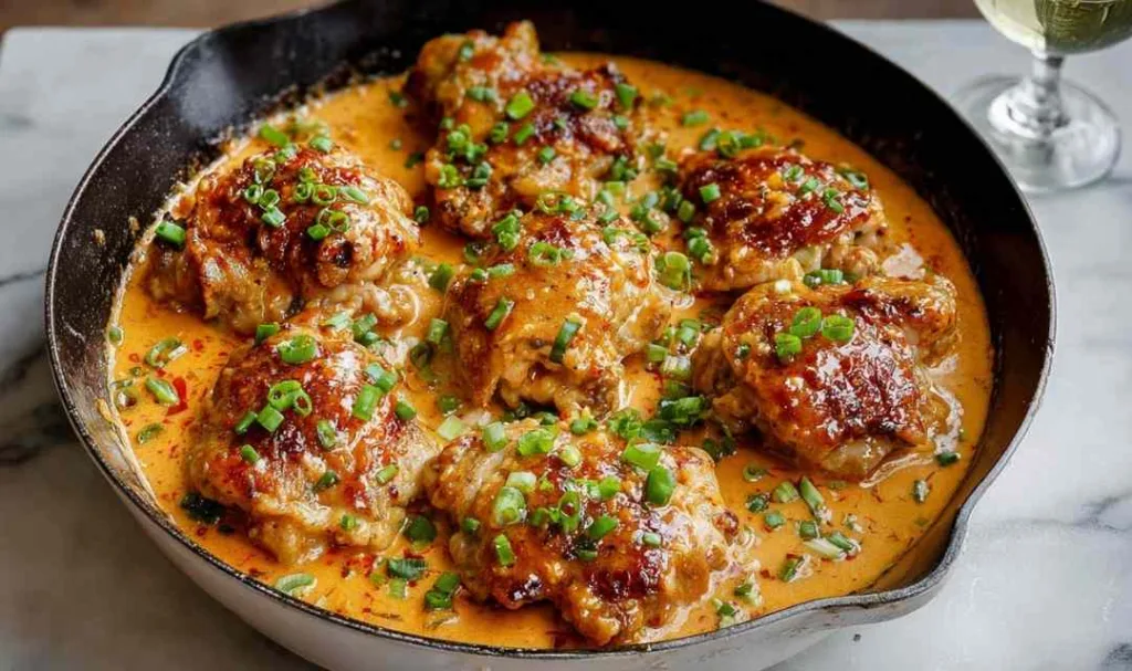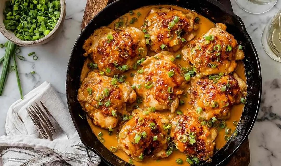 7. Return chicken thighs to the skillet, coating each piece thoroughly with the sauce. Garnish with chopped green onions and serve immediately.