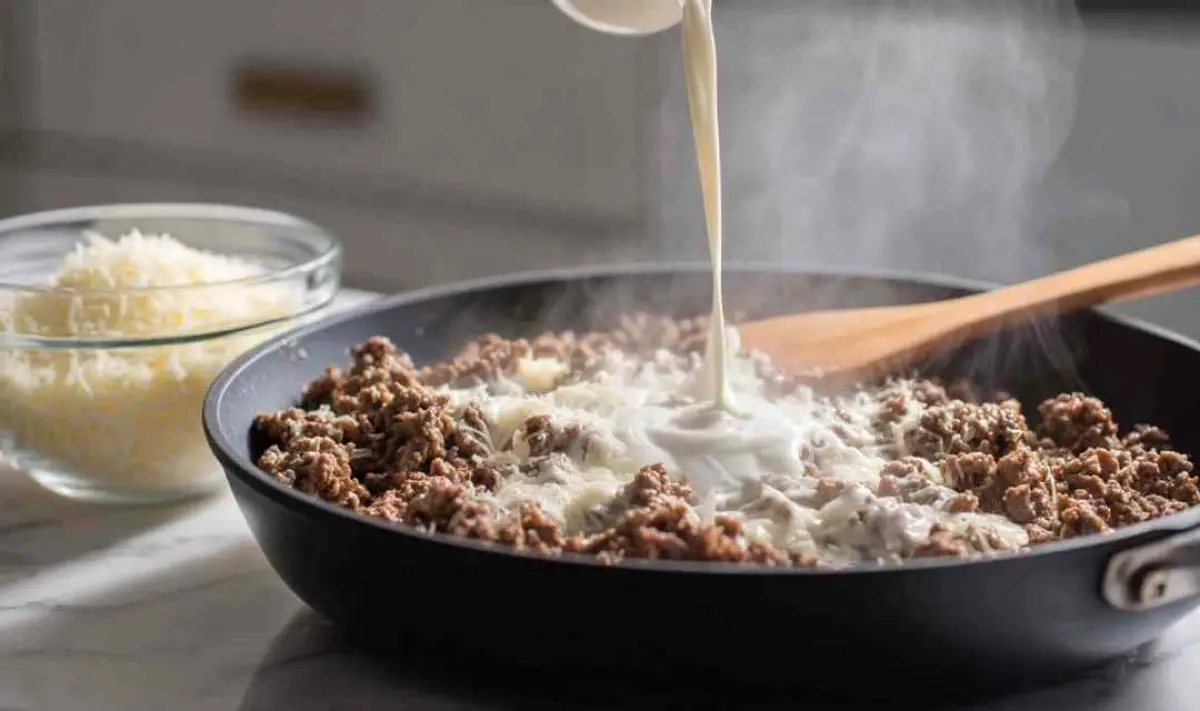 - Pour in the heavy cream and bring to a gentle simmer, stirring to combine with the beef and garlic.