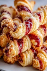 Buttery puff pastry twisted with sweet berry filling and finished with a light sugar glaze. These elegant pastries feature crispy, golden layers wrapped around fruity preserves.