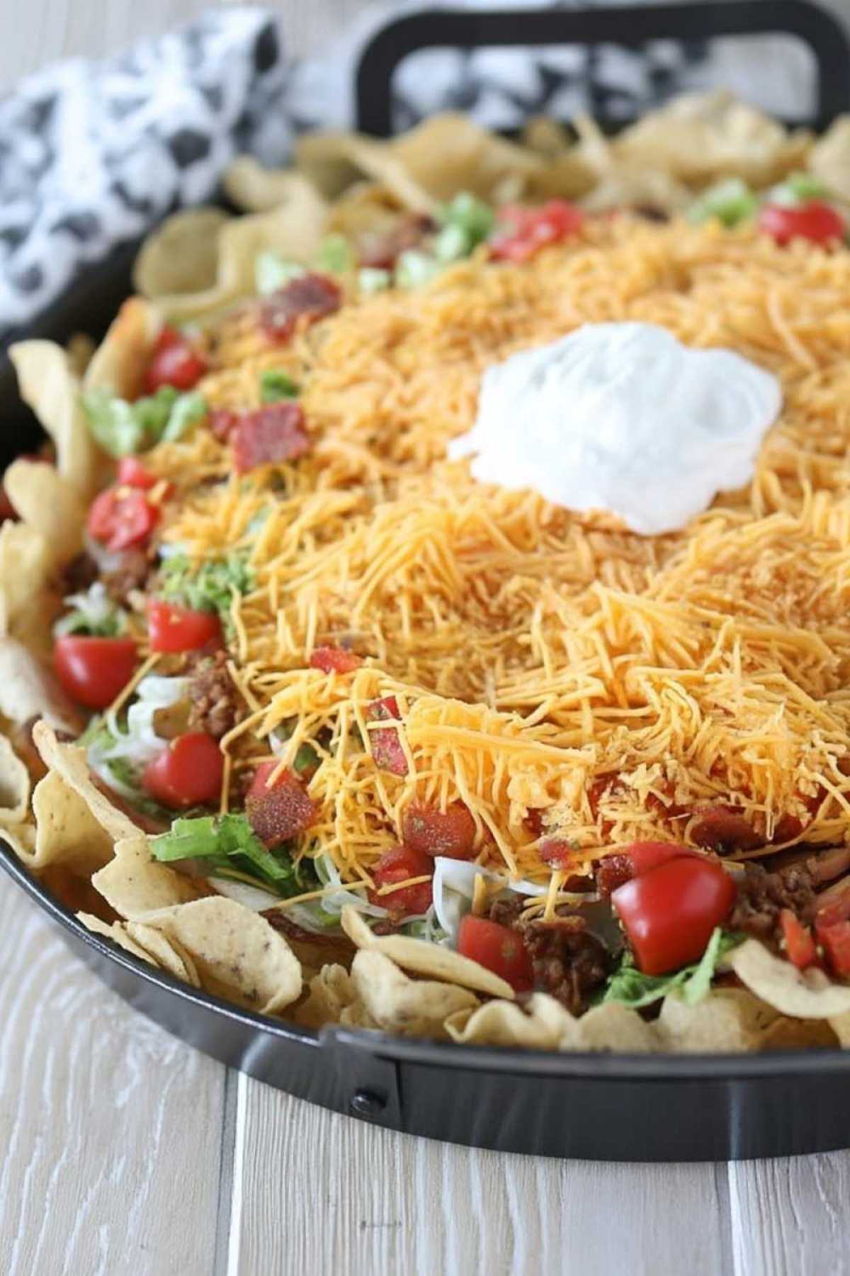 8. Top with shredded cheddar cheese, spreading it evenly to cover all layers.