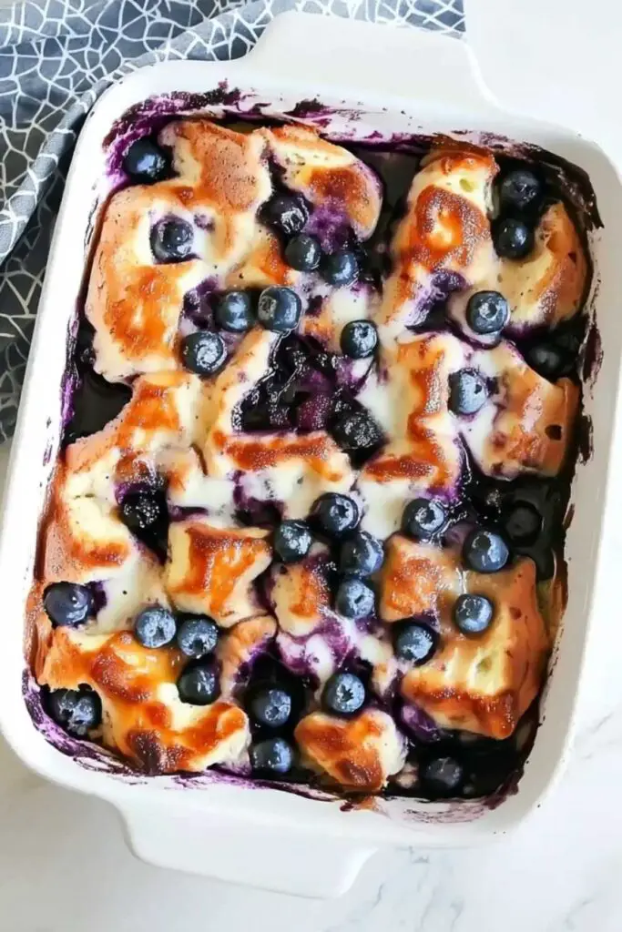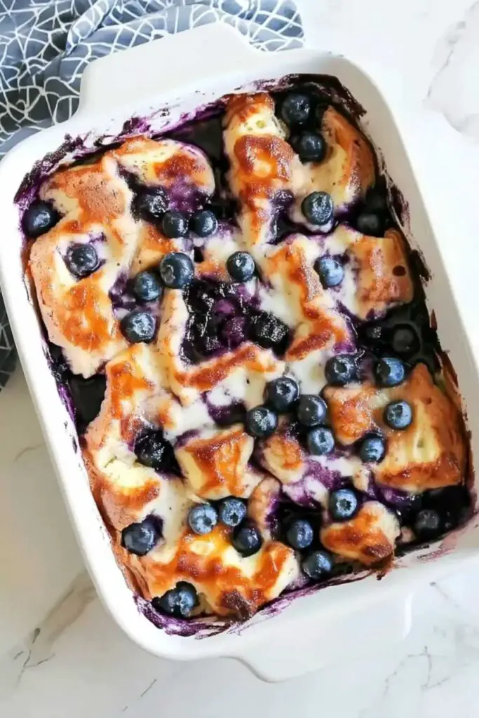 Can I use frozen blueberries instead of fresh? I recommend using frozen blueberries straight from the freezer without thawing – they work perfectly and actually release less juice during baking, preventing a soggy casserole.