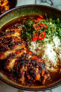 Tender chicken thighs simmered in an aromatic garlic ginger broth with soy sauce, served over fluffy jasmine rice for a comforting Asian-inspired meal.