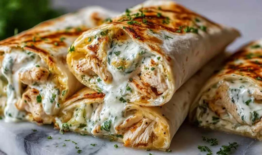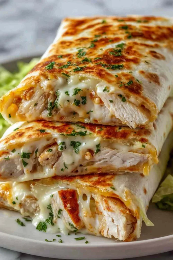 Quick and delicious wraps filled with seasoned chicken, melted mozzarella and cheddar cheese, and cream cheese, all wrapped in a crispy garlic butter-brushed tortilla. Ready in just 20 minutes.