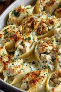 Tender jumbo pasta shells stuffed with creamy chicken and cheese filling, topped with homemade Alfredo sauce and baked until golden and bubbly.