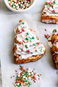 Can I make these Christmas Tree Cinnamon Rolls the night before? I recommend shaping them fresh on Christmas morning for the best texture, but if you’re pressed for time, you can shape them the night before, cover tightly with plastic wrap, refrigerate, and bake in the morning – just add 2-3 extra minutes to the baking time since they’ll be cold.