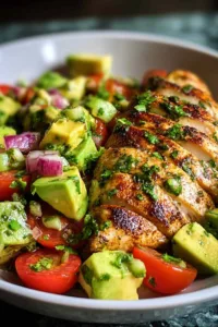 While the chicken is marinating, prepare the avocado salsa by gently combining diced avocados, red onion, tomato, lime juice, and salt in a separate bowl. Set aside.