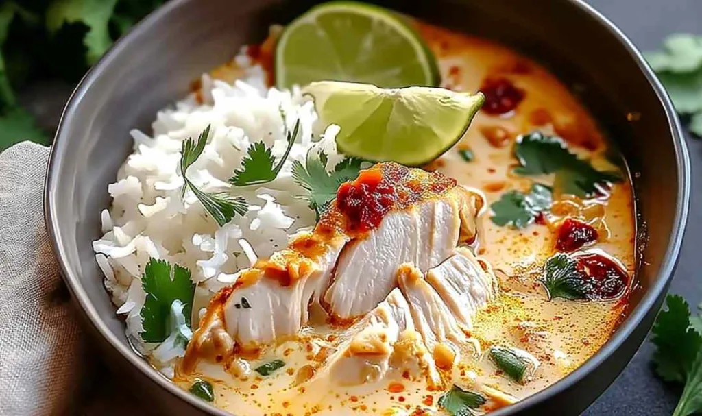Step 10. Serve your coconut chicken brothy rice in bowls, garnishing each portion with chopped green onions, fresh cilantro, and lime wedges on the side for squeezing over the top.