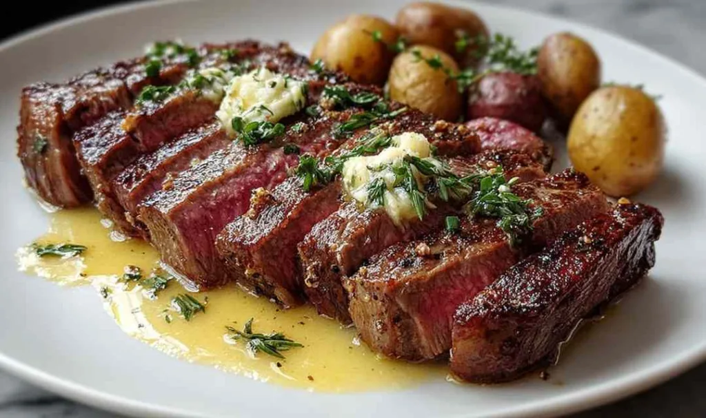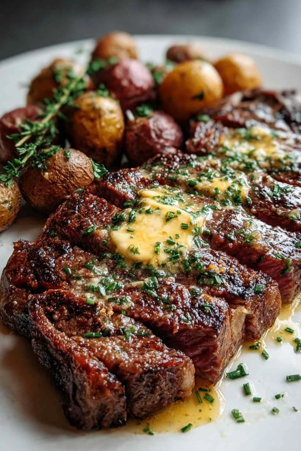 - Spoon the cowboy butter mixture generously and evenly over the steak and potatoes, coating everything thoroughly.