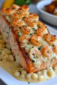 Luxurious salmon fillets stuffed with a creamy blend of lump crab meat, shrimp, cream cheese, and herbs, baked to golden perfection with buttery lemon undertones.