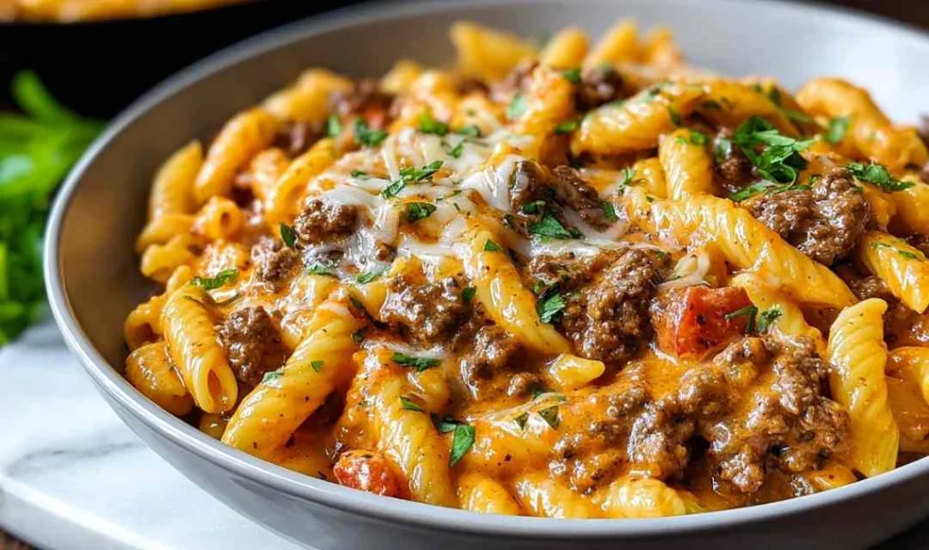 Creamy beef pasta transforms simple ingredients into restaurant-quality comfort food that’s ready in just 40 minutes. This rich, satisfying dish brings together tender penne, savory ground beef, and a velvety Parmesan cream sauce that coats every bite.