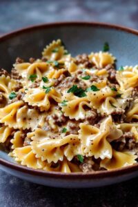 Creamy Parmesan Garlic Beef Bowtie Pasta brings together everything I love about weeknight cooking: bold flavors, simple ingredients, and a dish that makes everyone come back for seconds. There’s something magical about the way garlic and Parmesan meld together with tender ground beef and pasta.
