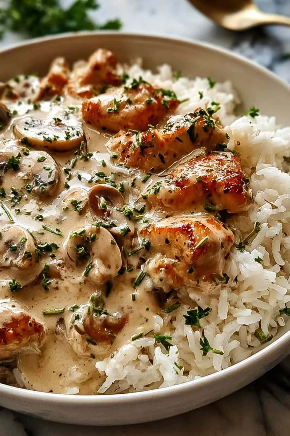 - Serve the creamy smothered chicken over warm cooked rice, drizzling extra sauce on top and garnishing with fresh chopped parsley.