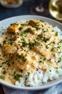 Step 9. For the best presentation, I serve immediately by plating fluffy rice first, then topping with smothered chicken and plenty of that incredible creamy sauce, finishing with fresh parsley.