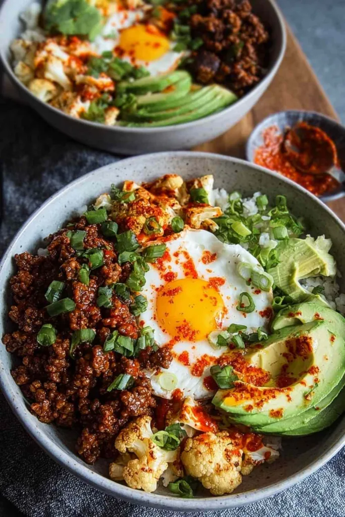 Crispy Chile Ground Beef and Cauliflower Protein Bowls