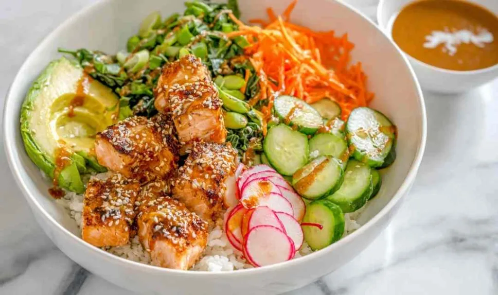 Many home cooks find success with meal prep by cooking the salmon and rice up to 3 days ahead, then assembling fresh bowls with vegetables and toppings right before eating.