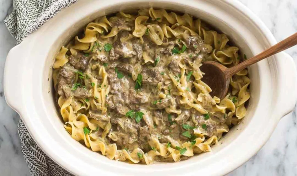 This recipe uses a two-phase approach: low and slow for the beef, then a quick finish on high for the noodles and gravy. Here is exactly how I make it.