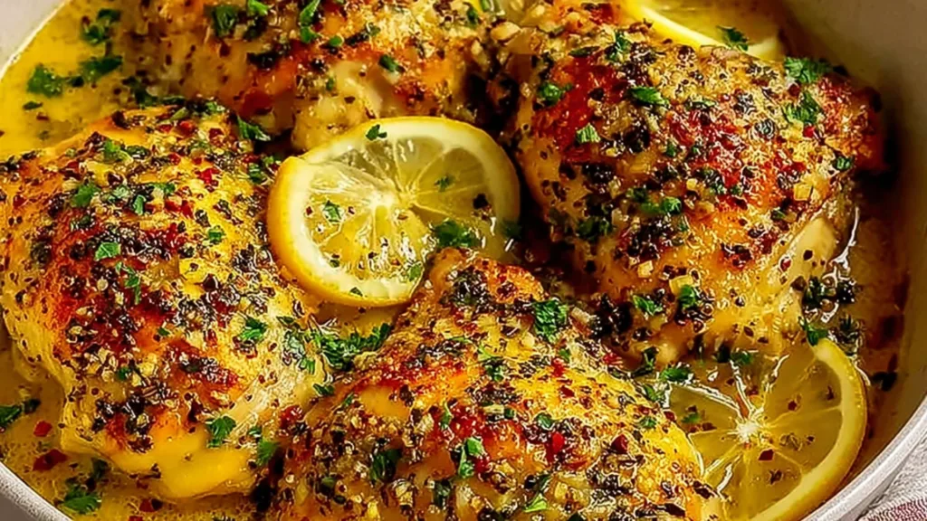8. Serve and garnish: Transfer the cooked chicken to a serving platter, drizzle generously with the buttery lemon garlic cooking liquid, and finish with a shower of fresh chopped parsley. Serve immediately alongside your favorite sides.