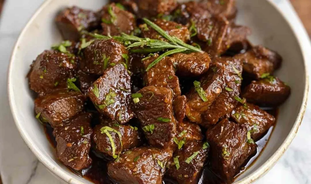 Step 10. Garnish with fresh chopped parsley if desired, then serve these crockpot steak bites warm over a bed of creamy mashed potatoes or buttered egg noodles.