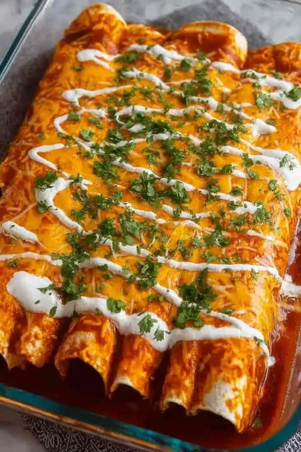8. Sprinkle the remaining three-quarters cup of shredded cheese evenly over the top of all enchiladas.