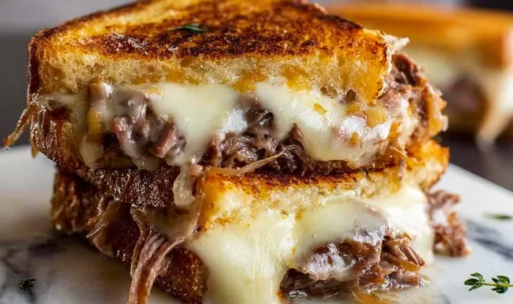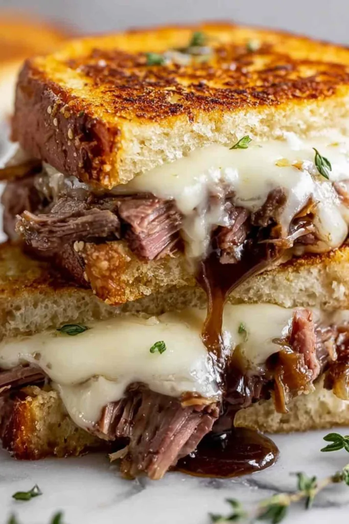 French Dip Grilled Cheese combines tender roast beef, melted Swiss cheese, and caramelized onions between crispy French bread, served with savory au jus for dipping.