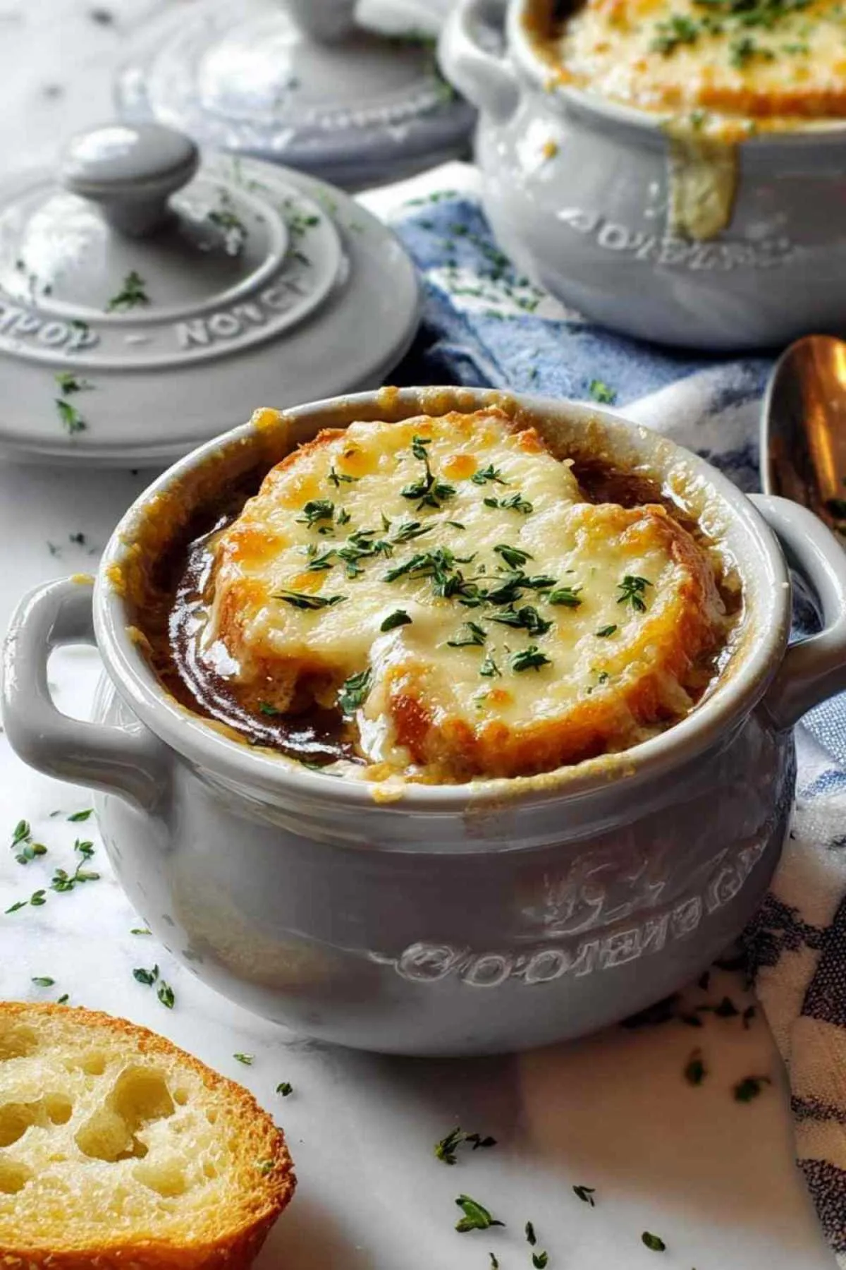 This soup freezes wonderfully for up to 3 months, though I recommend freezing it before adding the cheese-topped baguette. Pour cooled soup into freezer-safe containers, leaving about an inch of space at the top for expansion. When you’re ready to enjoy it, thaw overnight in the refrigerator, then reheat gently.