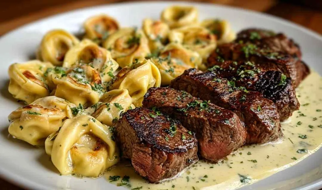 Garlic Butter Steak with Cheesy Alfredo Tortellini