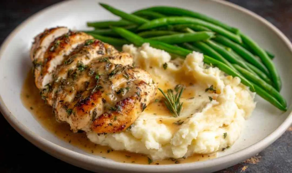 - Assemble the Plate: Plate a portion of mashed potatoes and green beans. Place the cooked chicken breast on the plate and spoon the gravy generously over the chicken and potatoes. Garnish with chopped fresh parsley and serve warm.