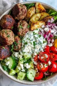 This Greek meatball bowl brings together everything I love about Mediterranean cooking – juicy herb-packed meatballs with a secret ingredient that keeps them incredibly tender, crispy roasted potatoes, and that cool, creamy tzatziki that ties it all together.