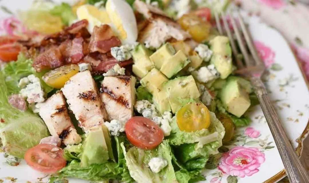 Grilled chicken Cobb salad with romaine, bacon, eggs, avocado, tomatoes, and blue cheese on a white plate