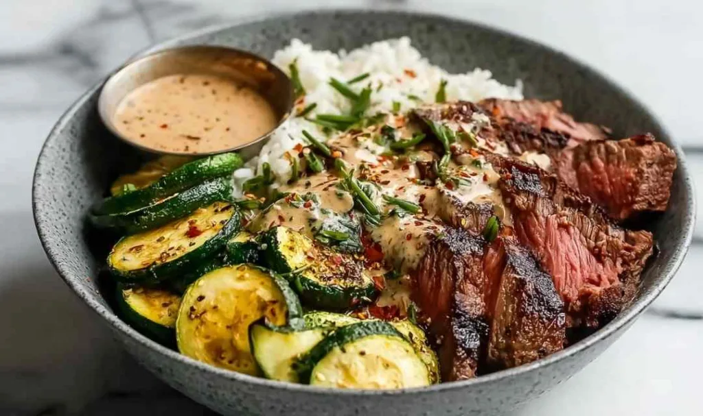 I remember the first time Betty made steak bowls for a summer gathering on the farm. Her grandkids were visiting, and she wanted something hearty but light enough for the warm evening. She grilled the steak on her cast iron skillet, the sizzle filling the kitchen with that unmistakable aroma of perfectly seared meat. The zucchini came fresh from her garden, and she whisked up a simple herb sauce that made everyone ask for seconds. What made it special wasn’t fancy ingredients, it was how everything came together in one satisfying bowl. The tender steak paired beautifully with the smoky vegetables, and that creamy sauce tied it all together. Betty always said the best meals are the ones you can customize to what you have on hand, and this bowl does exactly that. Time to fire up that skillet and bring some steakhouse flavor to your kitchen!