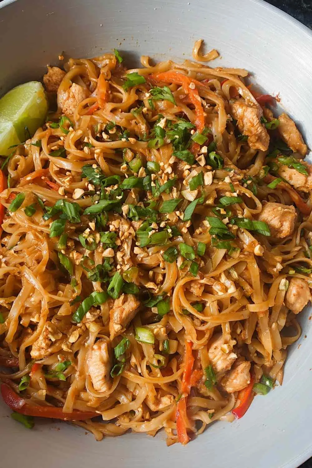 Step 9. Divide your Healthy Chicken Pad Thai into four bowls and top each one generously with crushed peanuts, extra green onions, and lime wedges on the side for squeezing.