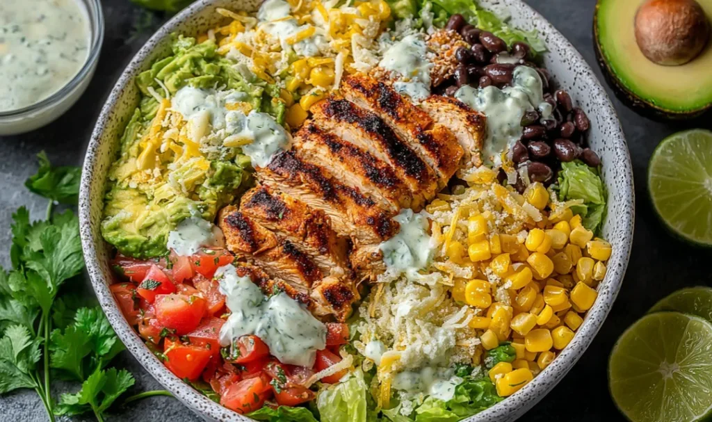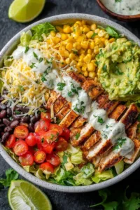 Assemble: In bowl, layer lettuce first. Top with sliced chicken, guac dollops, charred corn, and cheese.