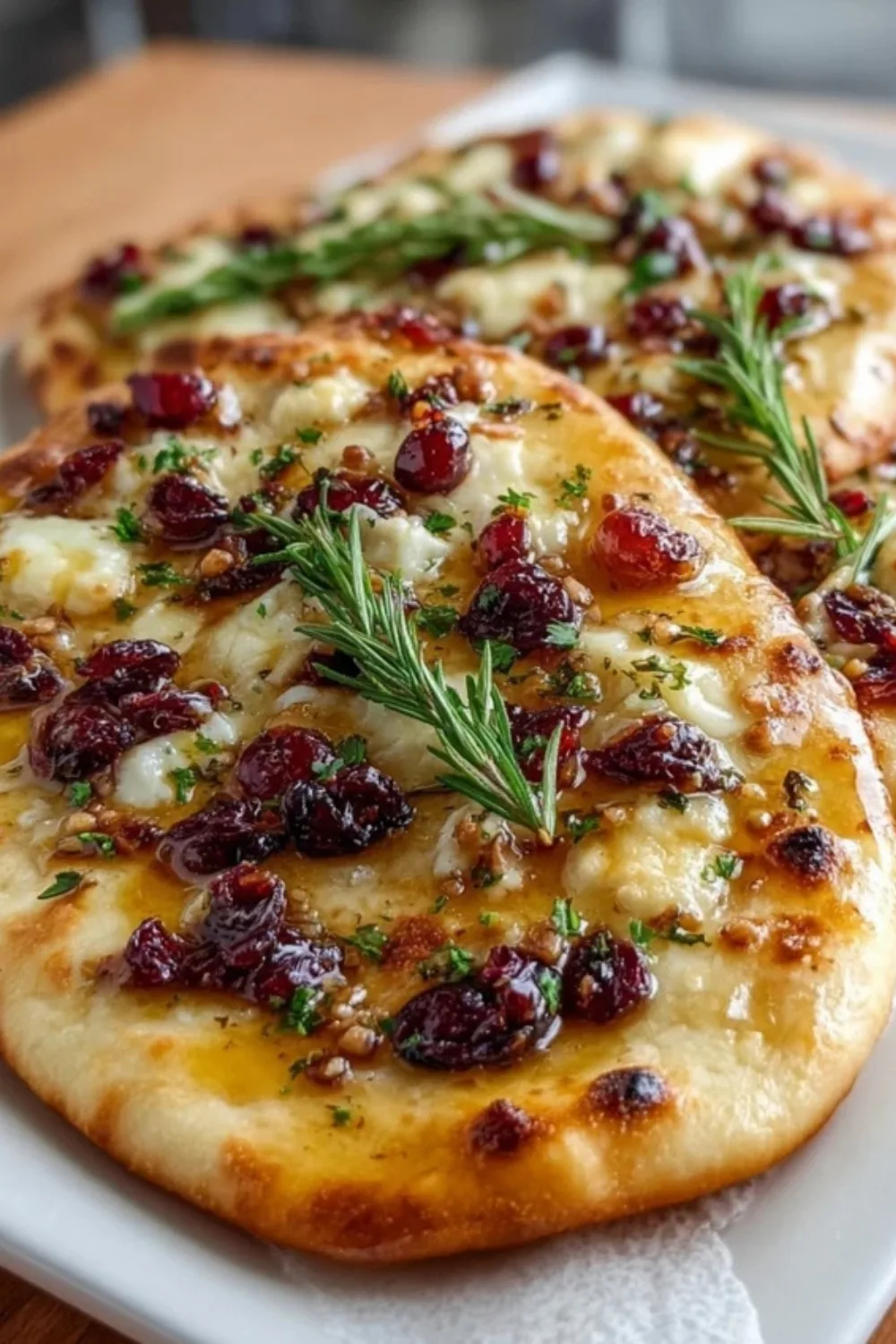 - Top each flatbread with sliced brie, then sprinkle cranberries, almonds, walnuts, and fresh thyme over the top.