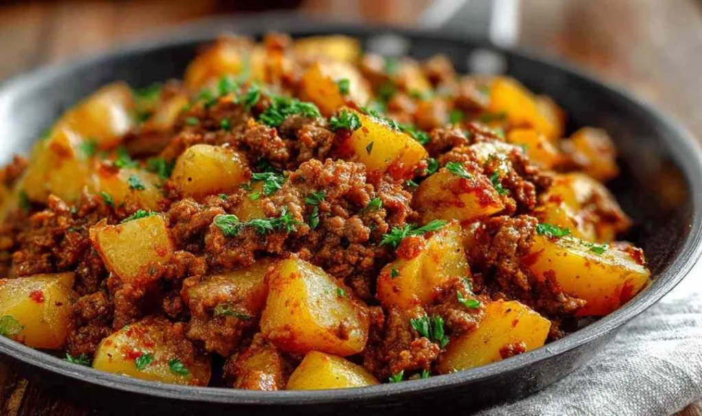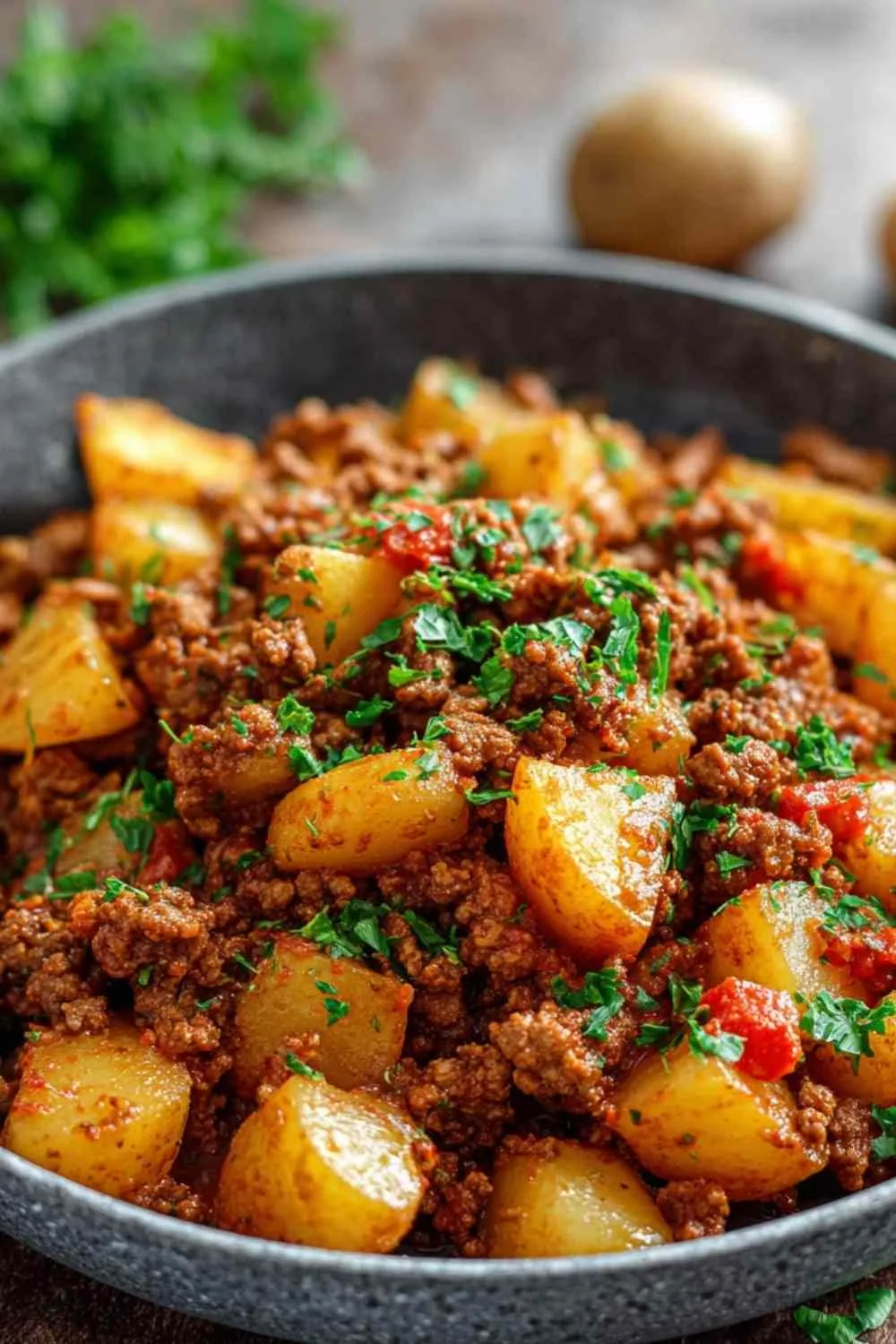 A hearty one-pan meal combining seasoned ground beef with tender potatoes in a savory sauce, delivering over 30 grams of protein per serving. Perfect for busy weeknights and budget-friendly family dinners.