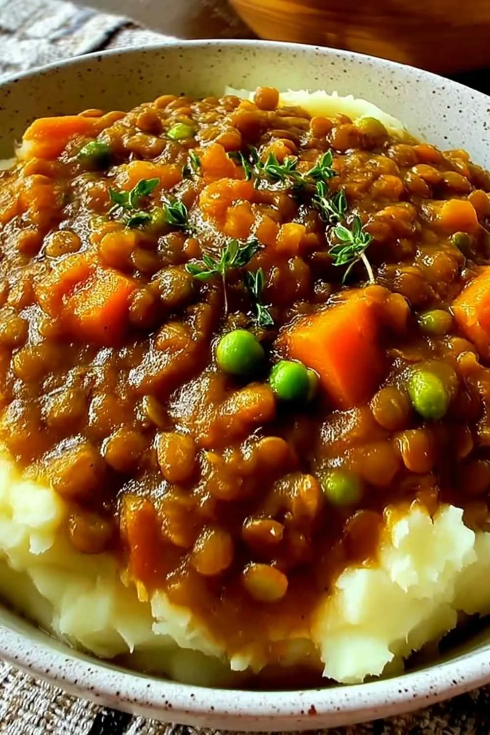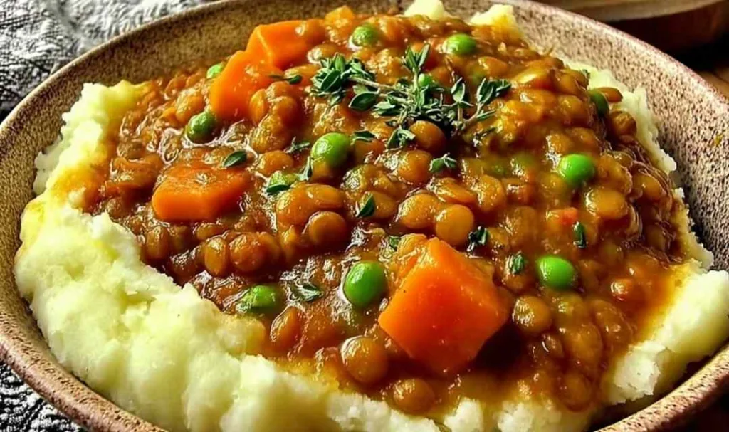High Protein Lentil Stew Over Mashed Potatoes