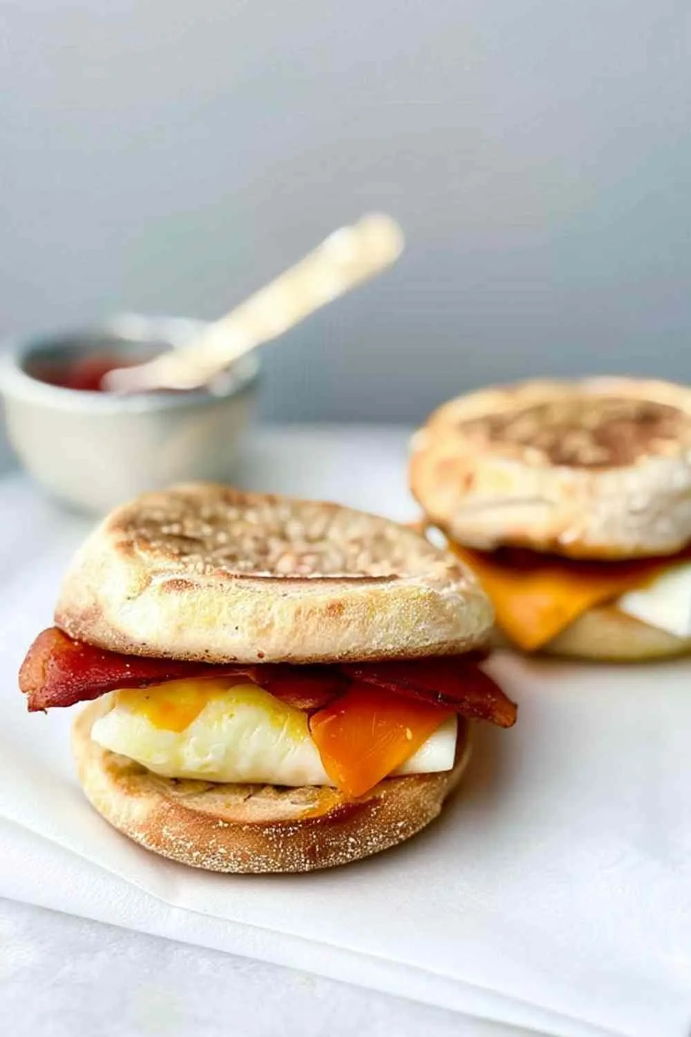 - Assemble the sandwich by layering the bottom muffin half, egg whites with cheese, turkey bacon, optional sauce, and top muffin half.