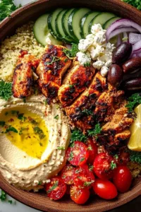 I’ll never forget the first time I tried a dish like this at a little café during a family trip years ago. The bright flavors of lemon and oregano, the creamy hummus, and those salty olives reminded me that simple ingredients can create something truly special. Back in my Midwest kitchen, I started experimenting with my own version, using the grilling techniques I learned from summer cookouts and combining them with wholesome grains and fresh vegetables. Now, this Mediterranean Chicken Bowl shows up on our dinner table at least twice a week. The best part is watching everyone customize their bowls with their favorite toppings. Let’s build these beautiful bowls together.