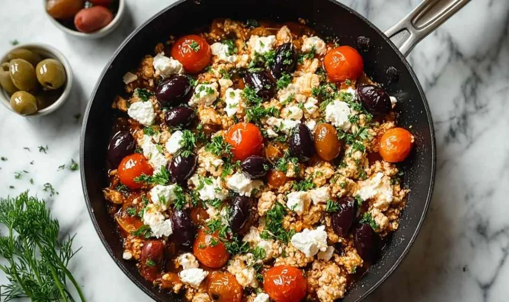 Mediterranean Keto Ground Chicken Skillet with Olives and Feta