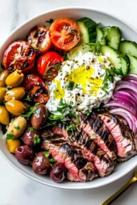 I remember the first time I tried something similar at a little family gathering. My neighbor had just returned from a trip to Greece and wanted to recreate some of the flavors she had experienced. We spent that Sunday afternoon in my kitchen, layering tender grilled steak over fluffy rice and topping it with the most refreshing cucumber sauce I had ever tasted. The combination was magical: the savory, herb-crusted meat balanced by cool, creamy tzatziki and bright, crisp vegetables. That day taught me that some of the best meals come from bringing together the familiar comfort of perfectly cooked steak with the fresh, vibrant flavors of Mediterranean cuisine. Time to create something truly special in your own kitchen.