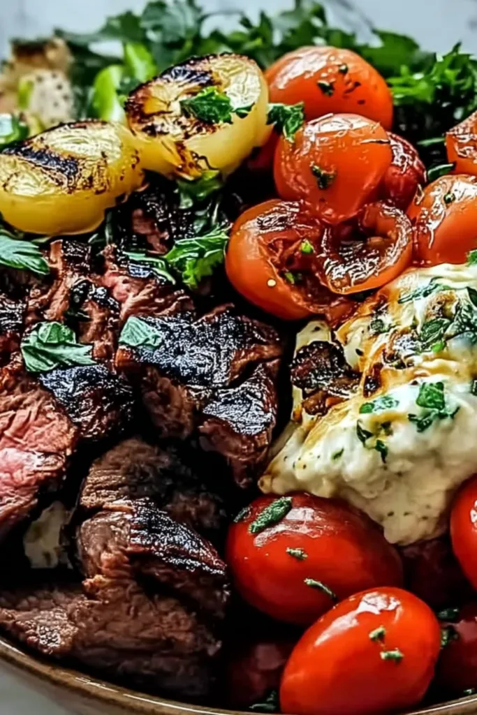 - Top each bowl with sliced steak, fresh vegetable mixture, crumbled feta cheese, and sliced Kalamata olives.