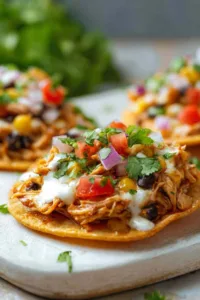 Step 6. After years of making Mexican rotisserie chicken tostadas, I’ve found that adding exactly 1/2 cup of the chicken mixture to each crispy tortilla creates the perfect ratio without overloading.