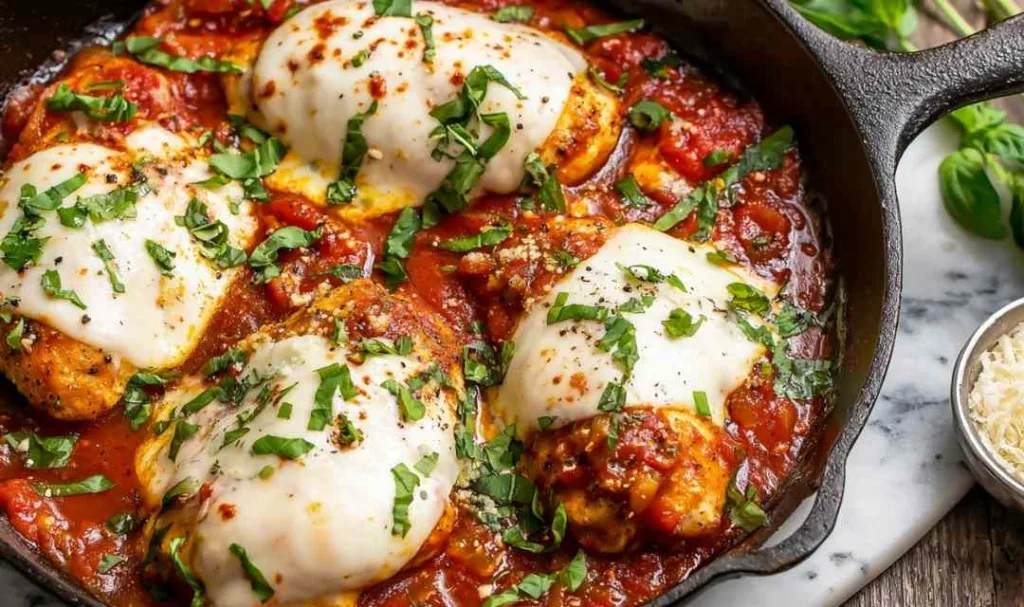 Mozzarella Chicken Skillet with melted cheese and tomato sauce