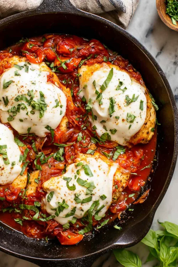 Fresh Mozzarella melts into creamy, stretchy perfection on top of the chicken, creating that irresistible cheese pull everyone loves.