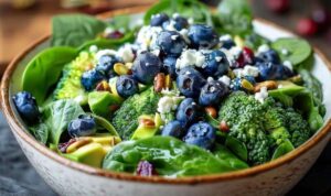 - In a large mixing bowl, combine blueberries, broccoli florets, spinach, and red onion.