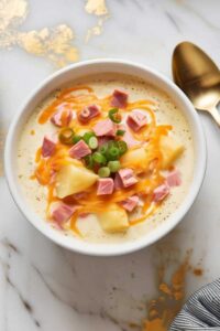 - Add 6 cups diced russet potatoes (cut into ½-inch cubes), 1 medium diced yellow onion, 2 cups diced cooked ham, 3 cups chicken broth, 1 ½ teaspoons garlic powder, 1 teaspoon onion powder, 1 teaspoon salt, and ½ teaspoon black pepper to the crockpot. Set to low for 6 hours or high for 4 hours.