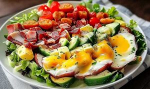 - Arrange chicken, bacon, avocado, eggs, tomatoes, and blue cheese on top.