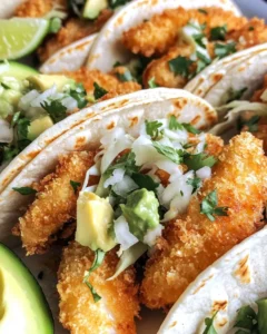 - Assemble the tacos by placing crispy fish on each tortilla and topping with avocado, cabbage, and cilantro.